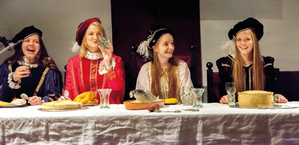 Die Besucher verwandeln sich mit Hilfe von historischen Kostümen in eine höfische Gesellschaft der Renaissance und erfahren unter anderen am eigenen Leib, wie damals getafelt wurde.