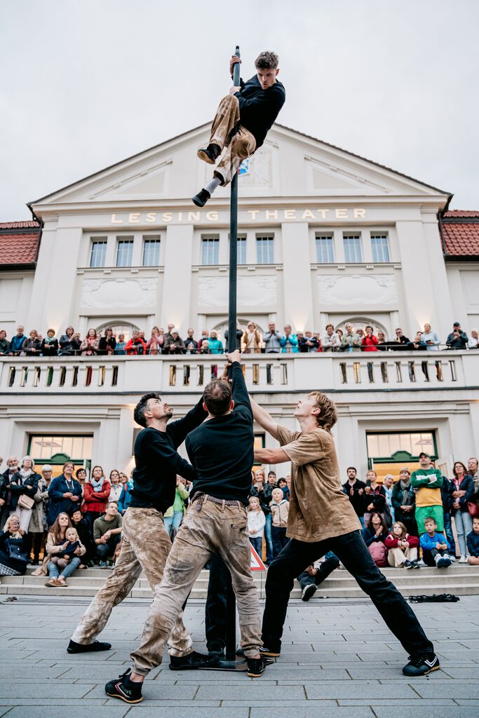Fr. 01.08.25, 20:00 Uhr, Marktplatz Lemgo – An diesem Abend machen sich The Funky Monkeys auf die Suche nach dem Wesen des Zusammenhalts. Mit urbanem Tanz, Akrobatik, Slapstick und poetischen Momenten erzählen sie auf dem Marktplatz von Fremdheit, Vertrauen und dem Ankommen in einer neuen Gemeinschaft. Unterstützt von einem Beatboxer und einem Piano-Spieler entfaltet sich eine energiegeladene Performance, in der ein gemeinsamer Groove entsteht. Dabei finden die Performerinnen und Performer Stück für Stück zusammen, und Vertrauen wird zur Basis ihrer spektakulären Artistik. Doch am Ende fehlt noch etwas – es braucht die Unterstützung des Publikums. Unter Spannung und Nervenkitzel legen The Funky Monkeys ihr Leben in die Hände der Sommertreff-Gäste und zeigen, dass buchstäblich nur mit Zusammenhalt Großes erreicht werden kann. Bei schlechtem Wetter wird ein Ausweichquartier angeboten, das auf der Website der Alten Hansestadt bekanntgegeben wird.