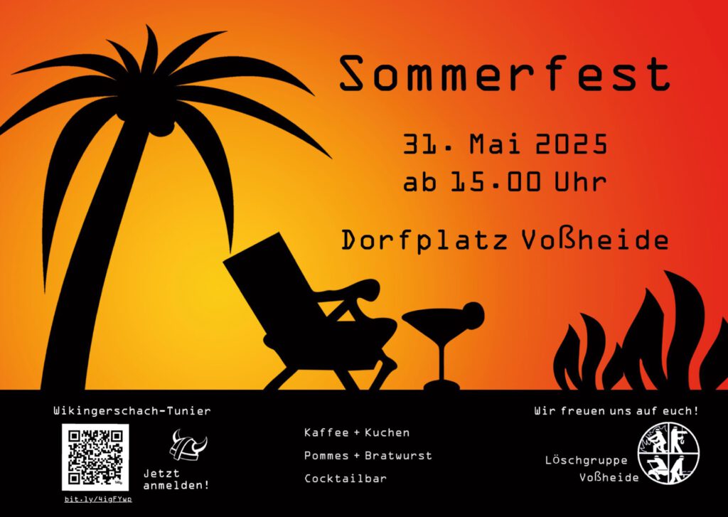 Aufgrund des großen Anklangs beim letzten Mal wird es auch dieses Jahr wieder ein Wikingerschach-Turnier geben. Gruppen zwischen 3 und 6 Personen sind herzlich eingeladen, daran teilzunehmen. Weitere Infos und Anmeldung ONLINE. Für das leibliche Wohl ist mit Kaffee und Kuchen, Leckerem vom Grill und einer Cocktailbar am Abend bestens gesorgt. Die Löschgruppe Voßheide freut sich auf rege Teilnahme.