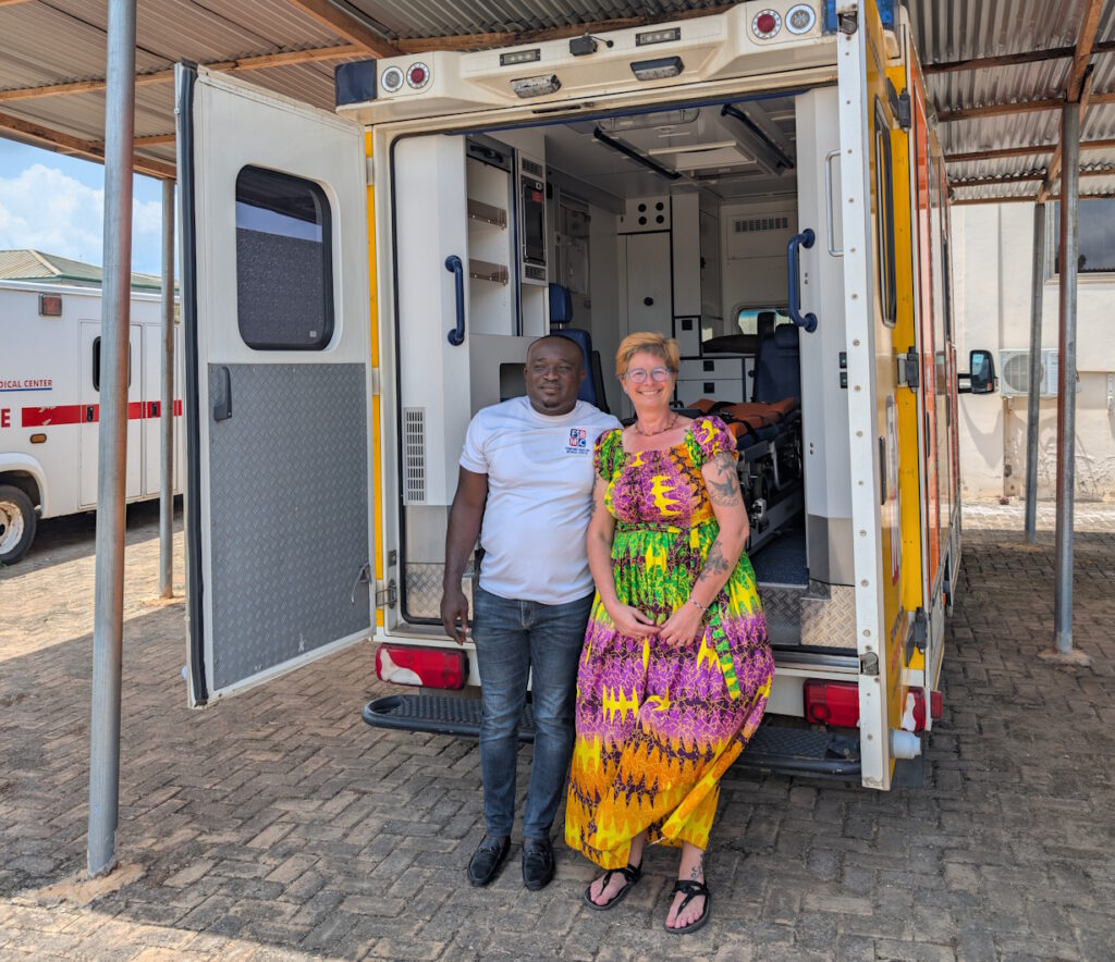 Kein Unbekannter: Friederike Saueressig und Richard Aboagye, Geschäftsführer des Frimpong-Boateng Medical Centers, stehen vor dem RTW, den die Notfallsanitäterin des Kreises in Lippe selbst gefahren ist.
