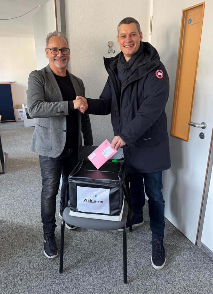 Lemgos erster Briefwähler ist Dr. Dr. Tank (rechts). Er ist sogenannter „Auslandsdeutscher“, wohnt in Shanghai, ist zurzeit in seiner Heimatstadt Lemgo zu Besuch und darf hier wählen, da Lemgo seine letzte Meldeadresse in Deutschland war. Auf dem Bild ist auch Andreas Fritz von der Abteilung Wahlen zu sehen.