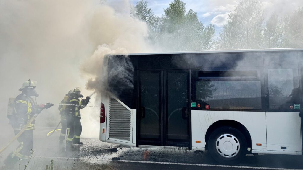 Bildquelle: Feuerwehr LemgoLemgo. Am letzten Freitag um kurz nach vier Uhr nachmittags wurde die Feuerwehr Lemgo und Lemgo Ost zu einem Busbrand auf dem Blomberger Weg gerufen. Aufgrund eines technischen Defektes hatte ein Linienbus während der Fahrt von Spork Richtung Brake erst Diesel verloren, dann entzündete sich der Motor. Die Busfahrerin bemerkte dies jedoch nicht. Ein dahinterfahrender PKW-Fahrer sah die Flammen und rief über Telefon die Polizei an. Diese forderte den Fahrer auf, sich vor den Bus zu setzen und den Fahrzeugführer auf den Schaden hinzuweisen. Als der Bus dann auf dem Seitenstreifen zum Stehen kam verließ die Fahrerin mit den Businsassen eiligst das Fahrzeug. Als die Feuerwehr an der Einsatzstelle eintrafen stellte sich die Lage wie folgt dar: der Bus selbst war im Motorraum als auch im hinteren Teil am Brennen. So gingen zwei Trupps unter Atemschutz zur Brandbekämpfung an und ins Fahrzeug vor. Nach gut 10 Minuten kam die Meldung „Feuer aus“. Weiter wurde die Einsatzstelle abgesichert und die Fahrbahn gereinigt.