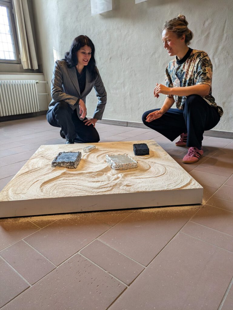Dr. Mayarí Granados (Kulturagentur Landesverband Lippe) und Künstlerin Anna Grebner mit der Installation “Reflection of an old moon”, 2025.