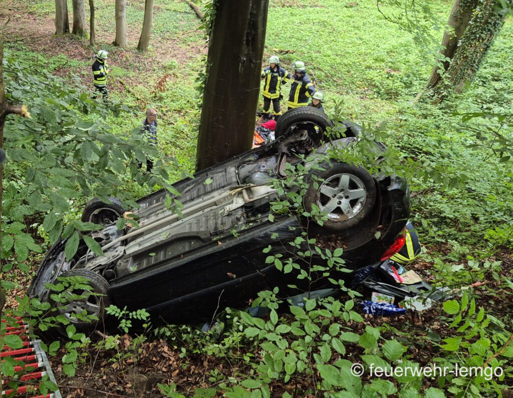 Lemgo. Am Montag, gegen 14.25 Uhr kam in einer Kurve auf der Residenzstraße zwischen Brake und Wahmbeckerheide eine Fahrerin mit ihrem PKW von der Fahrbahn ab und rutschte eine sechs Meter hohe Böschung herunter. Das Fahrzeug überschlug sich dabei und blieb an einem Baum auf dem Dach liegen. Die schwer verletzte Frau wurde von Ersthelfern und den ersten Einsatzkräften aus dem Fahrzeug befreit und noch vor Ort vom Rettungsdienst versorgt und später in ein Klinikum gebracht. Der Brandschutz für das verunfallte Fahrzeug wurde durch eine Löschgruppe sichergestellt. Die Residenzstraße war für die Rettungsmaßnahmen und Unfallermittlung gesperrt. Eingesetzt waren Kräfte vom Löschzug Lemgo und der Löschgruppe Wahmbeckerheide.
