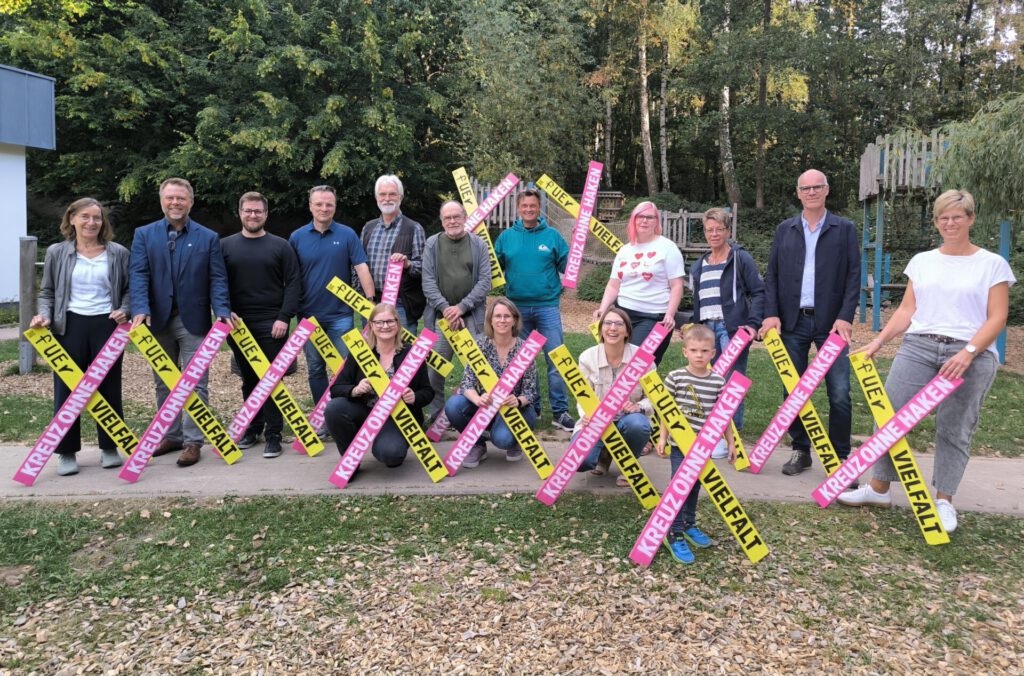 Bildquelle: Alte Hansestadt LemgoLemgo. Kürzlich wurden vor der Sitzung der Quartiersarbeit Lemgo Süd im Familienzentrum Wilde Wiese die ersten „Kreuze ohne Haken“ übergeben. Die Idee stammt ursprünglich aus dem Wendland von der Initiative Gruppe „beherzt – Für Demokratie und Vielfalt e.V.“ und hat sich inzwischen in ganz Deutschland verbreitet. Die Kreuze sollen ein sichtbares Zeichen sein: Für Toleranz, für das Miteinander verschiedener Kulturen und für eine lebendige Demokratie. Sie zeigen, dass Vielfalt die Freiheit nicht einschränkt, sondern im Gegenteil stärkt. Wer ein Kreuz aufstellt, setzt damit ein Zeichen für Demokratie und Offenheit. Bei der Sitzung stellte die Laubkerin Maja Taschner die Aktion vor. Die Lehrerin berichtete, dass Schüler der Friedrich-Wilhelm-Murnau-Gesamtschule in Bielefeld mit Genehmigung der Initiative die Kreuze im Rahmen eines Schulprojekts herstellen. Spontan bestellten etliche Anwohner aus Lemgo Süd und Umgebung eigene Kreuze, um ebenfalls ein Zeichen zu setzen. Auch Einrichtungen im Stadtteil machen mit. Die Nachbarschaft Lemgo Süd finanzierte zudem ein Kreuz für das Quartierszentrum in der Laubke und übergab es an die Stadt. Bürgermeister Markus Baier begrüßt die Aktion: „Es ist wichtig, dass wir als Stadtgesellschaft gemeinsam zeigen, wofür wir stehen: Für Respekt, Vielfalt und Demokratie. Solche sichtbaren Zeichen machen Mut, stärken den Zusammenhalt und sind gerade in der heutigen Zeit unverzichtbar.“