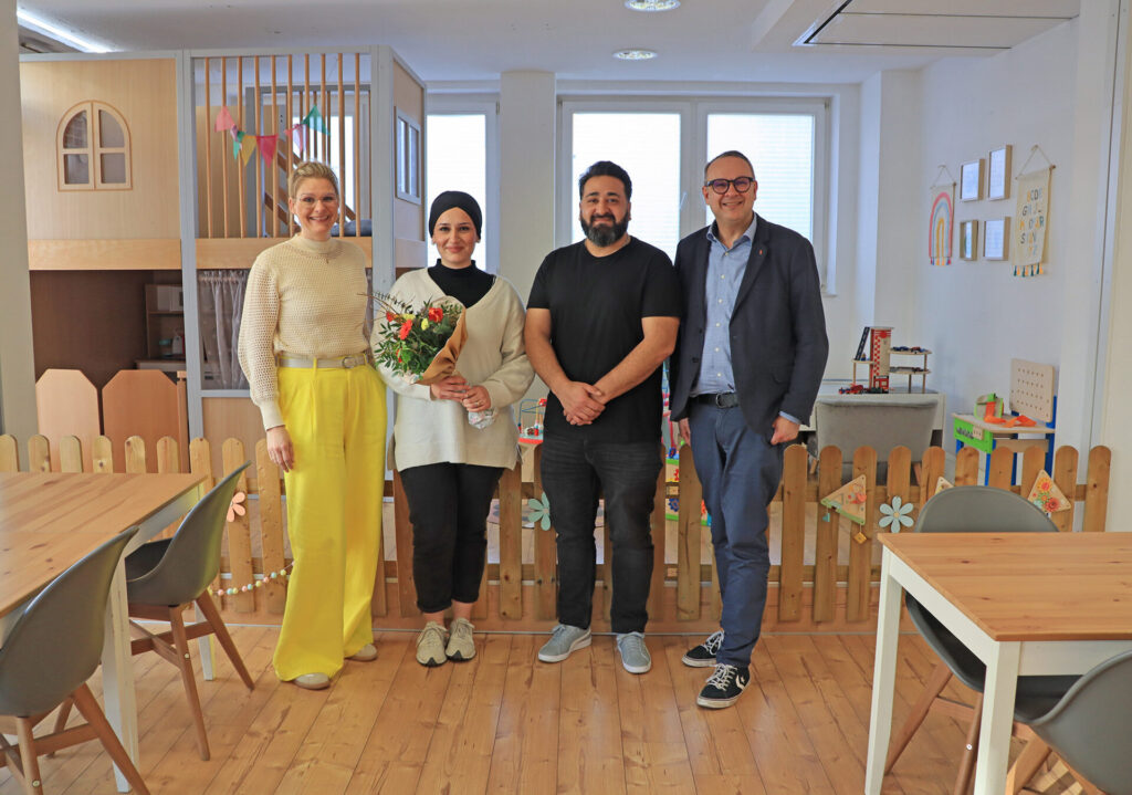 Rabea Kruel (Lemgo Marketing), Rumeysa Isikli und Caner Can (Inhaber von Café Kunterbunt) und Bürgermeister Markus Baier.