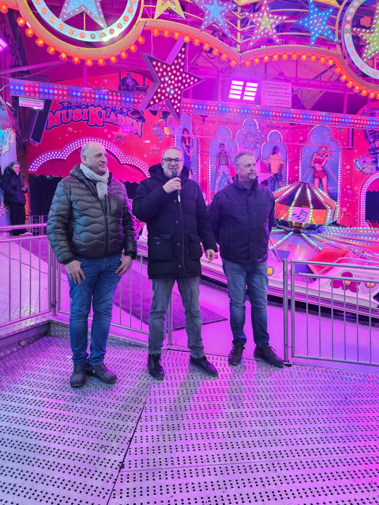 Siegbert Friedt, 2. Vorsitzender des lippischen Schaustellervereins, Bürgermeister Markus Baier und Antonio Noack, 1. Vorsitzender des lippischen Schaustellervereins, eröffnen Kläschen.
