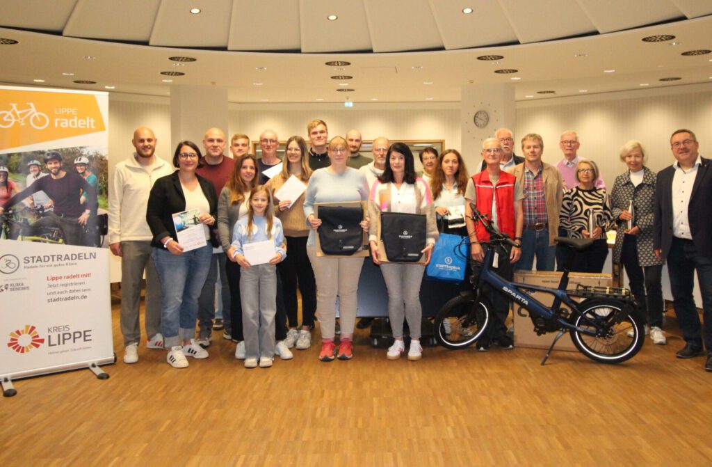 Bildquelle: Kreis LippeBereits zum neunten Mal hat der Kreis Lippe am STADTRADELN, ins Leben gerufen vom Klima-Bündnis, teilgenommen. Vom 18. Mai bis zum 7. Juni dieses Jahres haben 5.206 Lipper in 363 Teams insgesamt 948.488 Kilometer mit dem Fahrrad zurückgelegt. „Das ist zwar in diesem Jahr nicht die eine Million, aber dennoch ein beachtliches Ergebnis, auf das ich stolz bin“, sagt Landrat Axel Lehmann. Elf Lipper sowie ein Team und zwei Schulklassen konnten sich nun über attraktive Preise der Kreisverwaltung freuen. Zu gewinnen gab es ein Pedelec als Hauptpreis, vier Radreise-Gutscheine im Wert von 500 Euro, zwei Fahrradanhänger, zwei Stadthelme und zwei Fahrradtaschen. Verlost wurden diese Preise an alle Teilnehmenden, die mindestens einen Kilometer beim STADTRADELN gefahren sind. Eine weitere Fahrradtasche bekam Frauke Glaß-Fricke überreicht. Sie hat das Rad im gesamten dreiwöchigen Radelzeitraum als allgemeines Fortbewegungsmittel für sämtliche Strecken des Alltags genutzt und ist damit ein sogenannter STADTRADELN-Star. Im STADTRADELN-Stars-Blog hat sie über ihre Erfahrungen berichtet. Über den Team-Preis, Lippe-radelt-Flaschen, konnte sich das Team „Tafel Leopoldshöhe/Oerlinghausen“ freuen. Die Klasse 9b der Jacobischule in Kalletal erhält außerdem einen Gutschein für die Klimaerlebniswelt, die Grundschule Schule Am Schloss in Lemgo erhält Helmtüten für alle Gruppenmitglieder. Alle 16 Kommunen haben beim diesjährigen Stadtradeln mitgemacht. Während des Aktionszeitraums haben alle vielfältige Touren angeboten. Nicht zuletzt Dank der Unterstützung des ADFC Lippe und des großen Engagements von vielen fahrradbegeisterten Lippern.