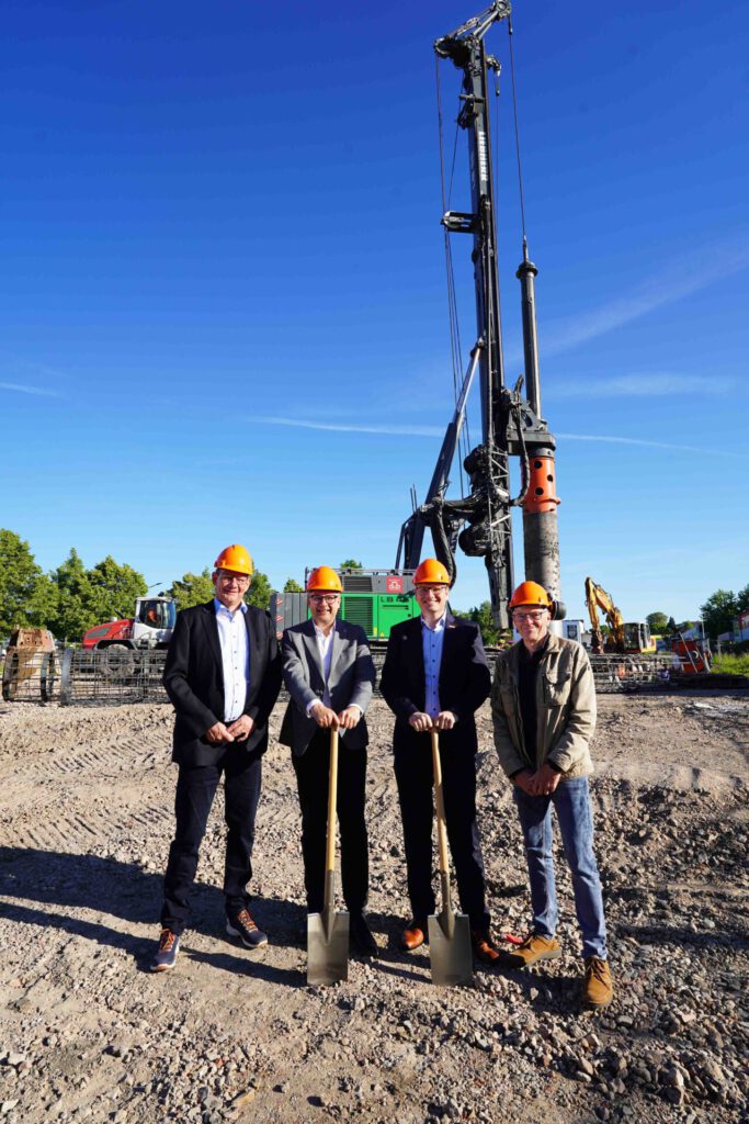Bildquelle: Stadtwerke LemgoLemgo. 50 Meter hoch und voller Energie: Mit dem symbolischen Spatenstich gaben Bürgermeister Markus Baier und Stadtwerke-Geschäftsführer Matthias Sasse den offiziellen Startschuss für den Bau eines Großwärmespeichers am Liemer Weg. Gemeinsam mit Projektleiter Uwe Weber und Georg Klene, Leiter der Eigenerzeugung, markierten sie den nächsten großen Meilenstein der nachhaltigen Wärmeversorgung Lemgos.