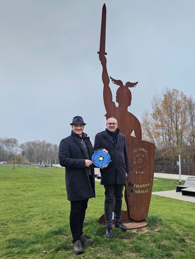 150 Zoll – passend zum 150-jährigen Jubiläum – ragt die Schwertspitze des Hermanns in den Himmel. Sein Standort auf der Campuswiese des Innovation Campus Lemgo hat dem Lemgoer Exemplar den Namen „innovativer Hermann“ eingebracht und 17 Partner sorgen nun gemeinsam dafür, dass die Figur Gäste des Campus, von Forschungsteams bis zu Handballfans, auch zukünftig begrüßt.