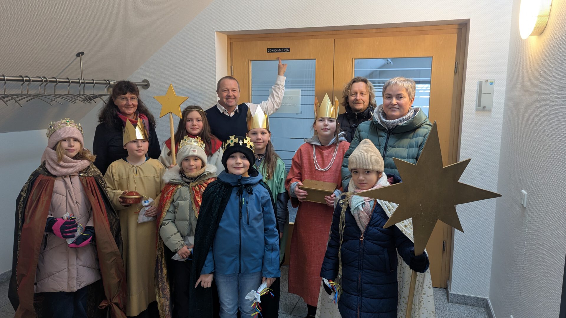 Kalletal-Hohenhausen: Die Sternsinger der katholischen St. Mariengemeinde Hohenhausen und der ev.-ref. Kirchengemeinde Talle haben zu Jahresbeginn das Kalletaler Rathaus besucht. So wurde auch in diesem Jahr der Brauch, dass Kinder als Sternsinger rund um den Dreikönigstag an den Haustüren klingeln und den Bewohnern ihren Segen für das neue Jahr zusprechen, fortgeführt. Dass das in einer gemeinsamen Aktion von katholischer und evangelischer Kirchengemeinde erfolgte, trägt dem Erfordernis des gesellschaftlichen Zusammenrückens in diesen Zeiten mehr denn je im Besonderen zusätzlich Rechnung. In den Kostümen der Heiligen Drei Könige Kaspar, Melchior und Balthasar brachten sie über der Eingangstür zum Sitzungssaal des Rathauses, als Zeichen für ein politisches Miteinander, den Segenswusch „20*C+M+B+26“ an. Die Kürzel stehen für die lateinische Segensbotschaft „Christus mansionem benedicat“, was übersetzt „Christus segne dieses Haus“ bedeutet. Die Sternsinger sangen außerdem ein Lied und trugen ein Gedicht vor. Die Initiatoren, Gemeindereferentin Ursula Kuhfuß aus Hohenhausen und Pastor Thorsten Rosenau aus Talle, zeigten sich zufrieden mit der Resonanz, konnten sie sich doch mit insgesamt acht „Sternsingern“ auf den Weg machen. Dabei sammelten sie Spenden, die über das Kindermissionswerk „Die Sternsinger“ im Rahmen der Aktion „Dreikönigssingen 2026“, die unter dem Motto „Schule statt Fabrik – Sternsingen gegen Kinderarbeit“ steht, anderen Kindern zugutekommen. Bei der Sternsingeraktion 2026 wird der Blick nach Bangladesch gerichtet. Trotz Fortschritten im Kampf gegen Kinderarbeit müssen in dem südasiatischen Land noch rund 1,8 Millionen Kinder und Jugendliche arbeiten – 1,1 Millionen sogar unter besonders gesundheitsschädlichen und ausbeuterischen Bedingungen. Sternsinger-Partnerorganisationen setzen sich dafür ein, Kinder aus Arbeitsverhältnissen zu befreien und ihnen den Schulbesuch zu ermöglichen.