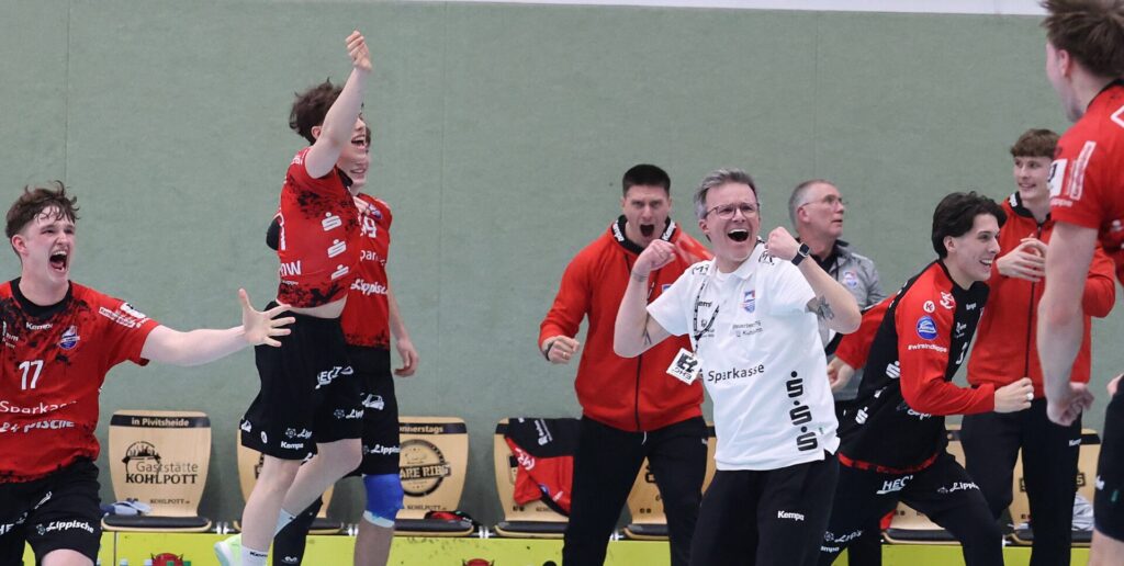 Möchten auch gegen Hagen II wieder Jubeln – Team HandbALL Lippe und Trainer Björn Piontek.
