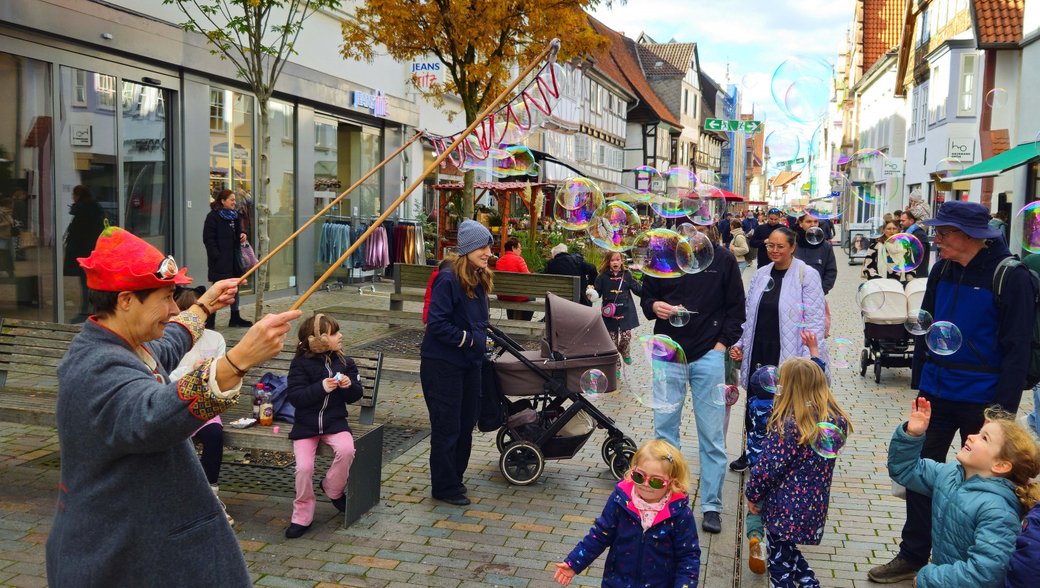 Der „Bruchmarkt“ lockte auch diesmal wieder zahlreiche Gäste bei sonnigen Herbstwetter in die Innenstadt. Der Samstag stand dabei ganz im Zeichen der Kinder. Es gab professionelles Kinderschminken, bei der sich zeitweise eine lange Schlange bildete, Ballonmodellage, wo die Kinder sich ein Tier oder eine Blume wünschen konnten und große Seifenblasen, die weit durch die Innenstadt schwebten. Bereits Freitag lockten schon einige Stände von Schaustellern in der Mittelstraße. Auf dem Marktplatz stand ab Samstag das traditionelle Kinderkarussell. Auch dabei die „Seenotretter“ mit ihrem Infomobil. Sie feiern dieses Jahr bereits ihr 160-jähriges Jubiläum. Eilers, Beresa, Pape und Stegelmann präsentierten im „Steinerner Saal“ ihre neuesten Modelle. „Die Lipper – Freunde alter Traktoren“ zeigten darüber hinaus am Ostertor ihre Fahrzeuge. Die Traktoren zogen die Kinder dabei magisch an. Zum „Bruchmarkt“ gehört am Sonntag auch immer der große „Bauernmarkt“ im Lippegarten, diesmal unter dem Motto: „Regional genießen“. Rund 40 Direktvermarkter brachten eine große Palette mit: frisches Obst, Säfte, Schafsfelle, Öl, Gestecke und herbstliche Dekorationen. Ab 13 Uhr fuhr am verkaufsoffenen Sonntag wieder der Stadtbus. Rundum ein großartiges Event, das von Lemgo Marketing mit vielen Sponsoren auf die Beine gestellt wurde.