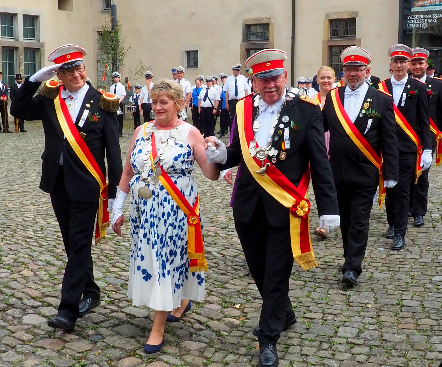 Lemgo/Brake. Auch zum diesjährigen Schützenfest zeigten die Braker und ihre Gäste mal wieder, dass sie des Feierns durchaus mächtig sind. Von Freitag bis Montag stand der Lemgoer Ortsteil dabei ganz im Zeichen der Schwarzkittel. Höhepunkt der Festivitäten war der große Festumzug am Sonntag, bei dem neben den sieben Baker Kompanien und Spielmannszügen auch Abordnungen aus befreundeten Gastvereinen teilnahmen. Am Montag wurde auf dem Schlosshof dann der neue König ausgerufen. Oliver Charles heißt das neue Oberhaupt der Braker Schützen. Er gehört der dritten Kompanie an und wird zusammen mit seiner Königin Daniela Schiebler die nächsten zwei Jahre der Braker Gemeinschaft vorstehen.